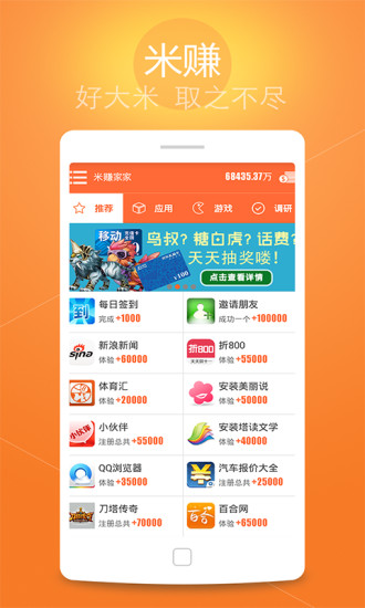 米赚由北京米拓世纪科技有限公司研发并运营,在2011年9月正式发布,是国内第一个专注于移动威客的手机应用,拥有3000万用户,是国内外知名的手机赚钱应用。 安装后完成新手任务即可兑换1Q币!也可兑换话费、提现到支付宝和微信等等!